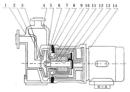 產品介紹 概述: ZCQ40-32-160化工自吸磁力驅動泵(以下簡稱自吸泵)是根據眾用戶的要求,在CQ型磁力泵的基礎上吸取國外技術,并經過工程技術人員反復研究試驗而成功的新產品。 該ZCQ40-32-160化工自吸磁力驅動泵以靜密封取代動密封,使泵的過流部件處于完全密封狀態,徹底解決了其它泵機械密封無法避免的跑、冒、滴、漏之弊病,泵體及過流部件的材料均采用了耐腐蝕的不銹鋼、鋼玉陶瓷、四氟石墨等材料制造,既有CQ型磁力驅動泵的功能,又集自吸于一身,不需底閥和引灌水,自吸高度4米。 ZCQ40-32-160化工自吸磁力驅動泵結構緊湊,外形美觀,體積小,噪音低,運行可靠,使用維修方便,可廣泛用于石油、化工、制藥、電鍍、印染、食品、科研等單位抽送酸、堿、油類及稀有貴重液、毒液、揮發性液體,以及循環水設備配套,特別是易漏、易燃、易爆液體的抽送。 因此,它是有廣泛的用途,我們真誠地向用戶推薦這種新產品。 型號意義: ![]() 結構圖: ![]()