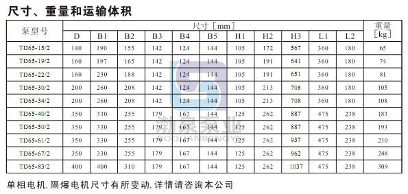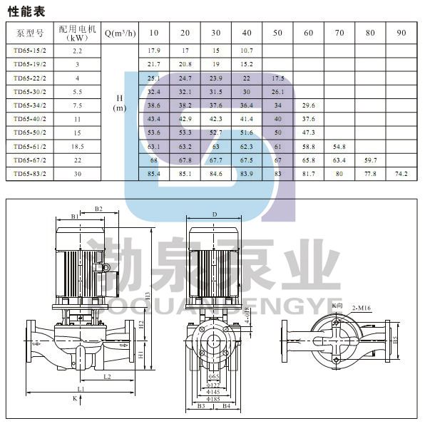 產(chǎn)品介紹 TD65-22/2生活熱水循環(huán)泵配有標(biāo)準(zhǔn)電機(jī)和機(jī)械密封。此類產(chǎn)品的結(jié)構(gòu)與相近類型產(chǎn)品相比,更不易受到泵送液體中雜質(zhì)的影響。 產(chǎn)品設(shè)計(jì)為頂部可拉出的拆裝形式,其可以在不影響管路系統(tǒng)的情況下對(duì)泵進(jìn)行維護(hù)。 應(yīng)用 產(chǎn)品適宜在清潔、稀薄、非侵蝕、非易爆易燃,且不含有任何可能對(duì)泵造成機(jī)械或化學(xué)損害的固體顆粒和纖維的液體中使用。具體對(duì)液體要求及應(yīng)用如下;而在液體粘稠或密度較大情況下使用時(shí)會(huì)造成泵特性曲線的下降和能耗的增加。 液體溫度:-15℃~110℃ 系統(tǒng)最高壓力:常規(guī)型為PN12巴;特殊型為PN16巴。 TD65-22/2生活熱水循環(huán)泵產(chǎn)品在用于輸送水時(shí),其可以用于生活用水、工業(yè)用水、冷卻系統(tǒng)用水和區(qū)域供熱系統(tǒng)的冷、熱用水。TD產(chǎn)品可以在以下位置使用: ·主循環(huán)泵 ·混合環(huán)路中的泵 ·鍋爐混流泵 ·燃?xì)饫鋬鰴C(jī)泵 ·部分流量過濾器泵 ·定壓系統(tǒng)用泵 ·生活熱水循環(huán) TD65-22/2生活熱水循環(huán)泵產(chǎn)品用于工業(yè)方面。如在化工、制藥、食品加工等行業(yè)。可以用于: ·原料的輸送 ·系統(tǒng)增壓 ·混合環(huán)路循環(huán)泵 ![]() ![]() 安裝條件 TD65-22/2生活熱水循環(huán)泵有不同的安裝要求,具體的安裝要求如下: ·系統(tǒng)管路具有支撐泵的能力,2.2kw以下(包括2.2kw)電機(jī)的泵可以直接懸置于管道中 ;系統(tǒng)管路不具有支撐泵的能力或泵電機(jī)功率大于2.2kw時(shí),泵必須安裝在支架或底板上。 ·對(duì)于配套2.2kw以下(包括2.2kw)電機(jī)的泵可以安裝在水平或垂直于管道的位置上;對(duì)于2.2kw以上電機(jī)的泵只能安裝在垂直于管道的位置上。 ·泵的安裝,要保證泵在使用時(shí)系統(tǒng)管路的張力不應(yīng)傳遞到泵體上。 ·為了保證電機(jī)的正常運(yùn)轉(zhuǎn),泵要安裝在保證有足夠冷卻的環(huán)境條件下,且冷卻空氣的溫度不能超過40℃。 ·如果泵安裝在戶外,必須配置合適的外罩以防止電器元件進(jìn)水或凝霜。 ·為了方便對(duì)泵的檢查和維修,在泵的上、下方必須留有足夠的空間。泵電機(jī)小于5.5kw時(shí)最小留300mm;泵電機(jī)大于5.5kw(包括5.5kw)時(shí)最小留1000mm。 ·為了防止噪音和振動(dòng),保證獲得最佳運(yùn)行效果,泵在安裝時(shí)要采用減振底座。一般采用水泥底座,底座的重量應(yīng)該是大于或等于1.5×泵重量。 ·為滿足客戶的不同需要,產(chǎn)品分為帶底板和不帶底板兩種。 因產(chǎn)品生產(chǎn)批次、型號(hào)不同,產(chǎn)品圖片及安裝尺寸僅供參考,詳情可聯(lián)系我們的銷售人員了解更多TD65-22/2生活熱水循環(huán)泵相關(guān)信息!