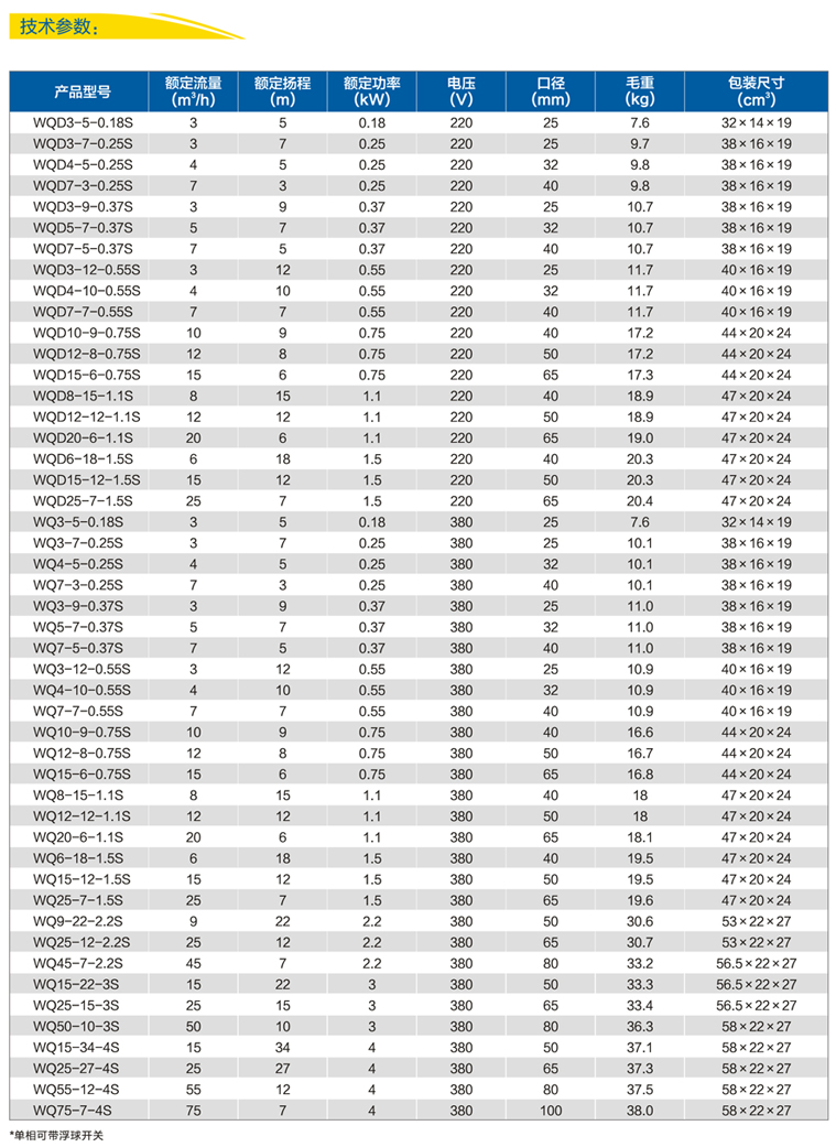 產(chǎn)品介紹 WQD3-7-0.25S不銹鋼污水潛水泵產(chǎn)品概述: 1、WQ(D)-S系列全不銹鋼精密鑄造污水污物潛水電泵采用獨特的單、雙流道式葉輪結(jié)構(gòu),大大提高了污物的通過能力,根據(jù)產(chǎn)品型號能通 過 泵口徑 5倍的纖維與直徑約為泵出口口徑50%的固體顆粒。 2、采用氟橡膠雙端面機封,氟橡膠徑向O型圈密封,有效地對環(huán)境惡劣的液體進行密封保護作用。 3、采用精密鑄造泵殼,重量輕、耐腐蝕、節(jié)能型、外形美觀、檢修方便,無需建泵房,潛入水中即可工作,減少工程造價。 4、電泵內(nèi)安裝過熱與電流保護器,防止電機過載發(fā)熱。 5、可根據(jù)客戶特殊要求定制防腐蝕電纜線、四氟機封,及高溫液體的零件配置。 WQD3-7-0.25S不銹鋼污水潛水泵使用條件: 1、以葉輪中心為準,潛入水下深度不得超過5m。 2、輸送介質(zhì)溫度不高于60℃。 3、輸送介質(zhì)的PH值304(4-10),316(2-13). WQD3-7-0.25S不銹鋼污水潛水泵產(chǎn)品用途: 適用于建筑樓宇、醫(yī)院、住宅小區(qū)、市政工程、道路交通及施工、工廠排污、養(yǎng)殖、藥業(yè)、飲料、海水鹽水、一般腐蝕性介質(zhì)中含有的固體顆粒、長纖維廢水、污水。 WQD3-7-0.25S不銹鋼污水潛水泵產(chǎn)品優(yōu)勢: WQD系列污水污物潛水電泵采用獨特的單雙流道式葉輪結(jié)構(gòu),氟橡膠雙端面機封、氟橡膠O型圈密封,不銹鋼焊接轉(zhuǎn)子軸,以及不銹鋼精密鑄造外殼。其中,國標法蘭系列采用雙端面、單端面雙套機封密封。該產(chǎn)品能有效地在惡劣的液體環(huán)境下工作,具有耐腐蝕、耐高溫等特點。特別適用于化糞池、化工液體、海水排澇等場合。 ![]() ![]() ![]() 因產(chǎn)品生產(chǎn)批次、型號不同,產(chǎn)品圖片及安裝尺寸僅供參考,詳情可聯(lián)系我們的銷售人員了解更多WQD3-7-0.25S不銹鋼污水潛水泵相關(guān)信息!