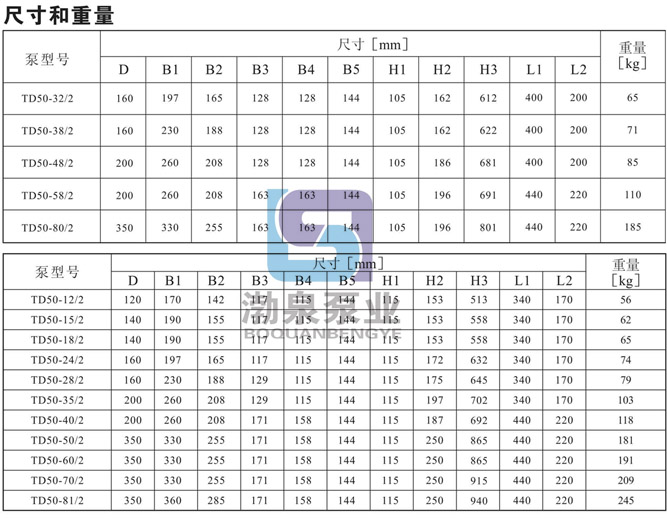 產(chǎn)品介紹 TD50-18/2 立式管道離心泵采用電機(jī)與泵可分離式結(jié)構(gòu),泵部分設(shè)計(jì)為可拉出形式。所有的該類產(chǎn)品都配有標(biāo)準(zhǔn)電機(jī)和機(jī)械密封。電機(jī)為全封閉、風(fēng)冷式標(biāo)準(zhǔn)電機(jī)。其主要尺寸符合JB/T8680標(biāo)準(zhǔn)。 產(chǎn)品泵體相當(dāng)于一段管路。在泵進(jìn)行維修時(shí),可以用盲法蘭將泵體封堵,從而不影響系統(tǒng)的正常運(yùn)行。 產(chǎn)品的聯(lián)接法蘭尺寸符合GB/T17241.6或IS07005-2/DIN2501標(biāo)準(zhǔn)中PN16時(shí)的有關(guān)規(guī)定。 產(chǎn)品的進(jìn)出口直徑符合有關(guān)標(biāo)準(zhǔn)尺寸。 產(chǎn)品的泵頭是聯(lián)接電機(jī)和泵的裝置。其與泵體之間的密封件采用“〇”形圈。 TD50-18/2 立式管道離心泵配有標(biāo)準(zhǔn)電機(jī)和機(jī)械密封。此類管道泵產(chǎn)品的結(jié)構(gòu)與相近類型產(chǎn)品相比,更不易受到泵送液體中雜質(zhì)的影響。 產(chǎn)品設(shè)計(jì)為頂部可拉出的拆裝形式,其可以在不影響管路系統(tǒng)的情況下對(duì)泵進(jìn)行維護(hù)。 應(yīng)用 產(chǎn)品適宜在清潔、稀薄、非侵蝕、非易爆易燃,且不含有任何可能對(duì)泵造成機(jī)械或化學(xué)損害的固體顆粒和纖維的液體中使用。具體對(duì)液體要求及應(yīng)用如下;而在液體粘稠或密度較大情況下使用時(shí)會(huì)造成泵特性曲線的下降和能耗的增加。 液體溫度:-15℃~110℃ 系統(tǒng)最高壓力:常規(guī)型為PN12巴;特殊型為PN16巴。 TD50-18/2 立式管道離心泵產(chǎn)品在用于輸送水時(shí),其可以用于生活用水、工業(yè)用水、冷卻系統(tǒng)用水和區(qū)域供熱系統(tǒng)的冷、熱用水。TD離心泵產(chǎn)品可以在以下位置使用: ·混合環(huán)路中的泵 ·鍋爐混流泵 ·燃?xì)饫鋬鰴C(jī)泵 ·部分流量過濾器泵 ·定壓系統(tǒng)用泵 ·生活熱水循環(huán) TD50-18/2 立式管道離心泵產(chǎn)品用于工業(yè)方面。如在化工、制藥、食品加工等行業(yè)。可以用于: ·原料的輸送 ·系統(tǒng)增壓 ·混合環(huán)路循環(huán)泵 ![]() ![]() ![]() ![]() 因產(chǎn)品生產(chǎn)批次、型號(hào)不同,產(chǎn)品圖片及安裝尺寸僅供參考,詳情可聯(lián)系我們的銷售人員了解更多TD50-18/2 立式管道離心泵相關(guān)信息!