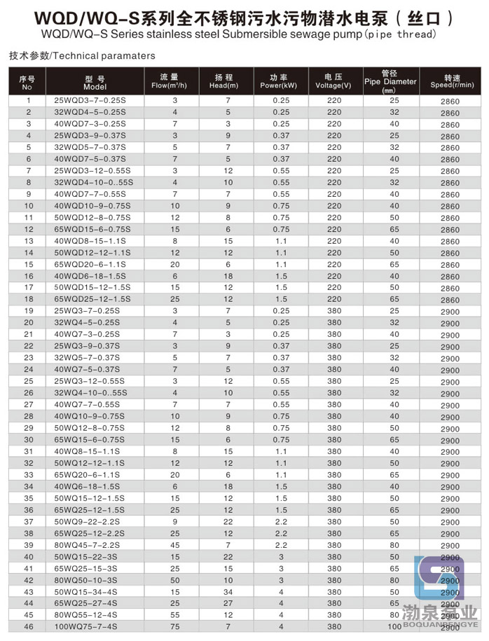 產品介紹 產品概述: 1、32WQ4-5-0.25S 不銹鋼污水污物潛水電泵采用獨特的單、雙流道式葉輪結構,大大提高了污物的通過能力,根據產品型號能通 過 泵口徑 5倍的纖維與直徑約為泵出口口徑50%的固體顆粒。 2、采用氟橡膠雙端面機封,氟橡膠徑向O型圈密封,有效地對環境惡劣的液體進行密封保護作用。 3、采用精密鑄造泵殼,重量輕、耐腐蝕、節能型、外形美觀、檢修方便,無需建泵房,潛入水中即可工作,減少工程造價。 4、排污泵內安裝過熱與電流保護器,防止電機過載發熱。 5、可根據客戶特殊要求定制防腐蝕電纜線、四氟機封,及高溫液體的零件配置。 使用條件: 1、以葉輪中心為準,潛入水下深度不得超過5m。 2、輸送介質溫度不高于60℃。 3、輸送介質的PH值304(4-10),316(2-13). 產品用途: 不銹鋼排污泵適用于建筑樓宇、醫院、住宅小區、市政工程、道路交通及施工、工廠排污、養殖、藥業、飲料、海水鹽水、一般腐蝕性介質中含有的固體顆粒、長纖維廢水、污水。 產品優勢: 32WQ4-5-0.25S 不銹鋼污水污物潛水電泵采用獨特的單雙流道式葉輪結構,氟橡膠雙端面機封、氟橡膠O型圈密封,不銹鋼焊接轉子軸,以及不銹鋼精密鑄造外殼。其中,國標法蘭系列采用雙端面、單端面雙套機封密封。該產品能有效地在惡劣的液體環境下工作,具有耐腐蝕、耐高溫等特點。特別適用于化糞池、化工液體、海水排澇等場合。 ![]() 因產品生產批次、型號不同,產品圖片及安裝尺寸僅供參考,詳情可聯系我們的銷售人員了解更多32WQ4-5-0.25S 不銹鋼污水污物潛水電泵相關信息!