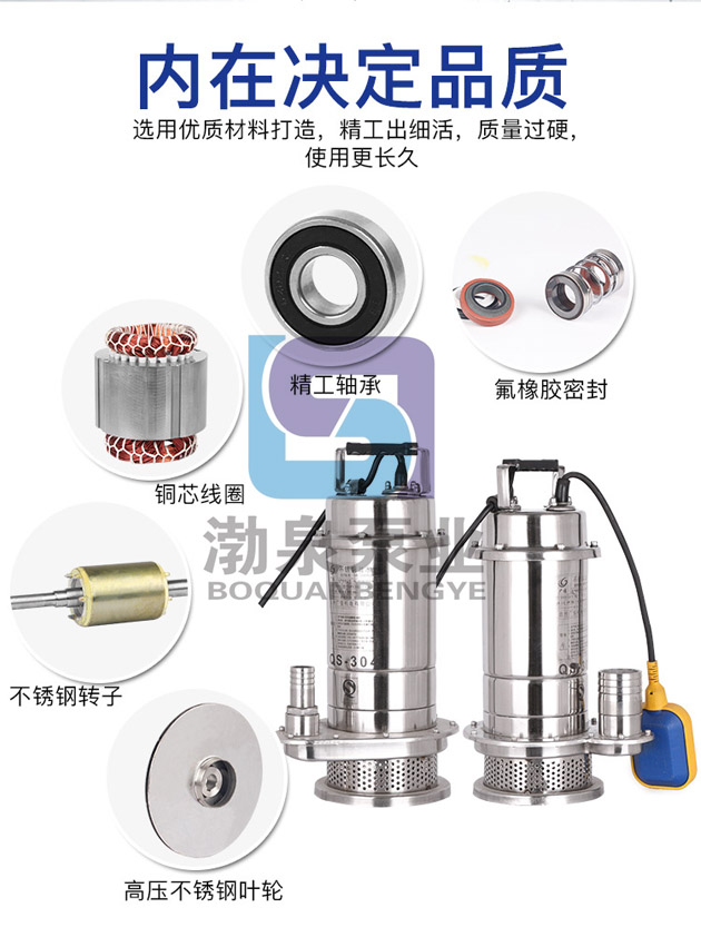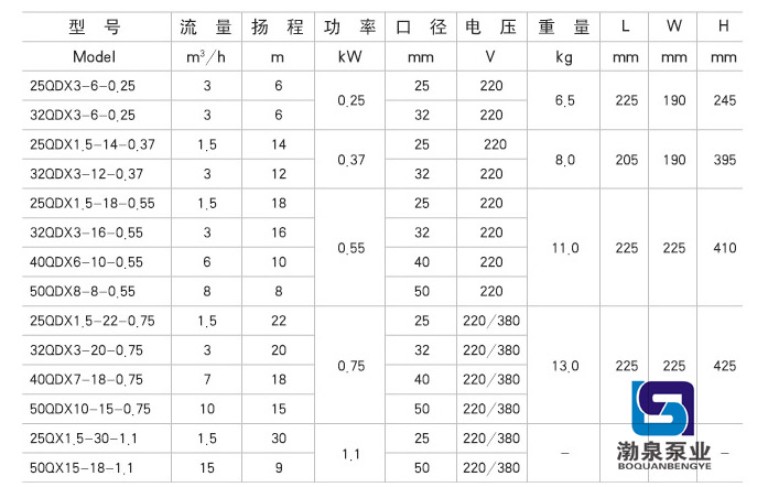 產品介紹 50QDX15-18-1.1 手提式耐酸堿小型潛水泵由水泵、密封、電動機三部分組成。電動機位于電泵上部,為單相或三相異步電動機,水泵位于電動機下部,為離心式葉輪,渦殼結構,水泵與電機之間采用雙端面機械密封。 用途: 50QDX15-18-1.1 手提式耐酸堿小型潛水泵系列不銹鋼潛水泵,主要用于農田灌溉、養殖供水、園林澆噴、旅館、食堂、高層建筑供水等。 優點: 體積小、重量輕、移動方便、安裝簡便、揚程高。 使用條件: 潛水泵在下列使用條件下應能連續正常工作: 1、介質溫度不超過+40℃; 2、介質的PH值在6.5-8.5之間; 3、介質中含固體雜質的體積比不超過0.1%,粒度不大于0.2mm 4、電源頻率為50Hz,電壓單相220V、三相380V,電壓波動范圍為額定值的0.9-1.1倍; 5、潛水深度不超過5m。 使用注意事項 1、使用前請仔細檢查電纜線,檢查是否在運輸過程中是否造成電纜線的破損。檢查完好后接入控制箱使用。 2、控制箱必須帶有過流、過壓(三相380V±5%、單相220V±5%的電源范圍內)、缺相、反轉、防漏電功能等保護裝置。 3、必須斷開電源后對水泵進行檢查維修。 4、在未斷開電源的情況下身體任何部位(特別是手指)不得靠近水泵進水口位置。避免以外發生。 ![]() ![]() ![]() ![]() 因產品生產批次、型號不同,產品圖片及安裝尺寸僅供參考,詳情可聯系我們的銷售人員了解更多50QDX15-18-1.1 手提式耐酸堿小型潛水泵相關信息!