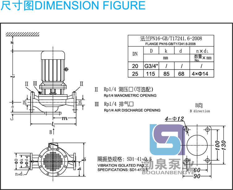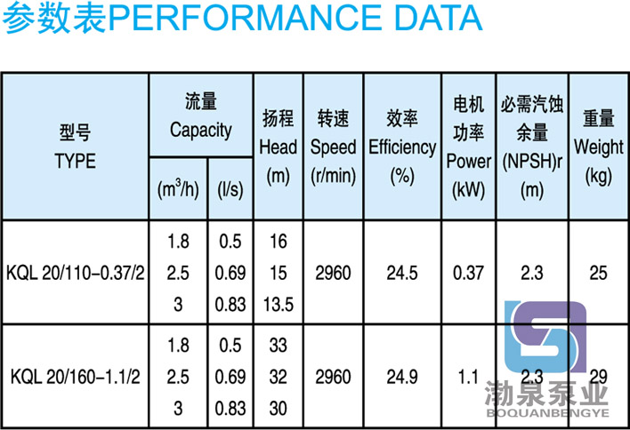 產品介紹 KQL20/160-1.1/2 立式管道循環泵供輸送不含固體顆粒的清水及物理化學性質類似于水的液體之用。同時根據使用溫度、介質等不同在ISG型管道離心泵基礎上派出適用熱水、高溫、腐蝕性化工泵、油泵。該產品具有同效節能、噪音低、性能穩定等特點。 用途: KQL20/160-1.1/2 立式管道循環泵用于空調、采暖、衛生用水、水處理冷卻冷凍系統、液體循環和供水、增壓及灌溉等領域中無腐蝕的冷水和熱水輸送。 工作條件: 轉速:2960r/min,1480r/min或980r/min 流量范圍:1.8~2000m3/h 揚程:≤127m 介質溫度:-10℃~120℃ 環境溫度:最大+40℃;海拔高度小于1000m;相對濕度不超過95% 材質: 泵殼、泵蓋、葉輪:鑄鐵 泵軸:45#鋼鍍鉻或不銹鋼(2Cr13) 機械密封動、靜環:浸銻石墨、碳化硅 結構:結構緊湊的單級泵,適用于現代建筑物。 產品特點: KQL20/160-1.1/2 立式管道循環泵結構緊湊、合理,泵與電機直接連接,外形美觀,占地面積小效率高,閉式鑄鐵葉輪,軸承配置合理,葉輪懸臂短,機泵軸完全同心,泵運行平穩、可靠,噪音低壽命長,強制環流沖洗機械密封,免保養、無滲漏。 選型指南: 例如:KQL80/160-7.5/2 或KQW80/160-7.5 KQL標準立式單級離心泵,KQW標準臥式單級離心泵 80進出口直徑 160葉輪名義直徑 7.5/2電機功率/電機極數 ![]() ![]() 因產品生產批次、型號不同,產品圖片及安裝尺寸僅供參考,詳情可聯系我們的銷售人員了解更多KQL20/160-1.1/2 立式管道循環泵相關信息!
