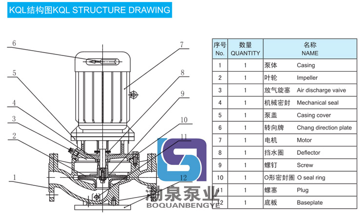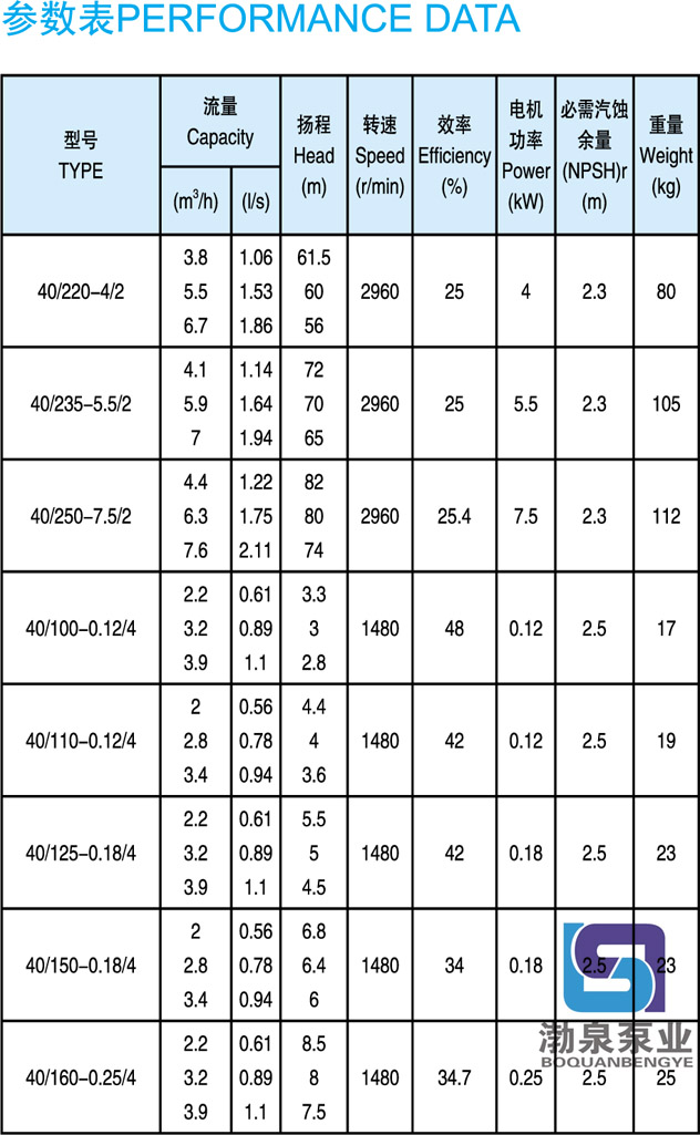 產品介紹 KQL40/160-0.25/4 低揚程管道離心泵供輸送不含固體顆粒的清水及物理化學性質類似于水的液體之用。同時根據使用溫度、介質等不同在ISG型管道離心泵基礎上派出適用熱水、高溫、腐蝕性化工泵、油泵。該產品具有同效節能、噪音低、性能穩定等特點。 用途: KQL40/160-0.25/4 低揚程管道離心泵用于空調、采暖、衛生用水、水處理冷卻冷凍系統、液體循環和供水、增壓及灌溉等領域中無腐蝕的冷水和熱水輸送。 工作條件: 轉速:2960r/min,1480r/min或980r/min 流量范圍:1.8~2000m3/h 揚程:≤127m 介質溫度:-10℃~120℃ 環境溫度:最大+40℃;海拔高度小于1000m;相對濕度不超過95% 材質: 泵殼、泵蓋、葉輪:鑄鐵 泵軸:45#鋼鍍鉻或不銹鋼(2Cr13) 機械密封動、靜環:浸銻石墨、碳化硅 結構:結構緊湊的單級泵,適用于現代建筑物。 產品特點: KQL40/160-0.25/4 低揚程管道離心泵結構緊湊、合理,泵與電機直接連接,外形美觀,占地面積小效率高,閉式鑄鐵葉輪,葉輪懸臂短,機泵軸完全同心,泵運行平穩、可靠,噪音低壽命長,強制環流沖洗機械密封,免保養、無滲漏。 管道泵選型指南: 例如:KQL80/160-7.5/2 或KQW80/160-7.5 KQL標準立式單級離心泵,KQW標準臥式單級離心泵 80進出口直徑 160葉輪名義直徑 7.5/2電機功率/電機極數 ![]() ![]() 因產品生產批次、型號不同,產品圖片及安裝尺寸僅供參考,詳情可聯系我們的銷售人員了解更多KQL40/160-0.25/4 低揚程管道離心泵相關信息!