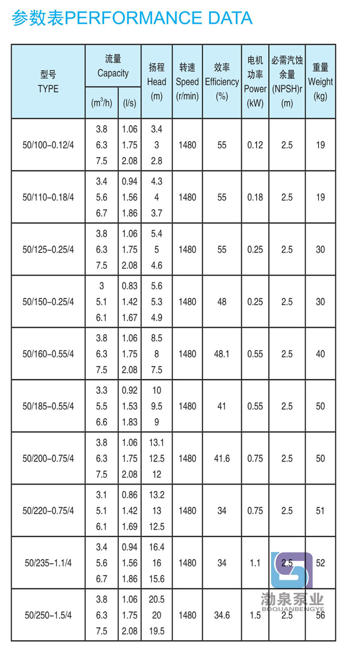 產(chǎn)品介紹 KQL50/125-0.25/4 熱水循環(huán)管道泵供輸送不含固體顆粒的清水及物理化學性質(zhì)類似于水的液體之用。同時根據(jù)使用溫度、介質(zhì)等不同在ISG型管道離心泵基礎上派出適用熱水、高溫、腐蝕性化工泵、油泵。該產(chǎn)品具有同效節(jié)能、噪音低、性能穩(wěn)定等特點。 用途: KQL50/125-0.25/4 熱水循環(huán)管道泵用于空調(diào)、采暖、衛(wèi)生用水、水處理冷卻冷凍系統(tǒng)、液體循環(huán)和供水、增壓及灌溉等領域中無腐蝕的冷水和熱水輸送。 工作條件: 轉(zhuǎn)速:2960r/min,1480r/min或980r/min 流量范圍:1.8~2000m3/h 揚程:≤127m 介質(zhì)溫度:-10℃~120℃ 環(huán)境溫度:最大+40℃;海拔高度小于1000m;相對濕度不超過95% 材質(zhì): 泵殼、泵蓋、葉輪:鑄鐵 泵軸:45#鋼鍍鉻或不銹鋼(2Cr13) 機械密封動、靜環(huán):浸銻石墨、碳化硅 結(jié)構(gòu):結(jié)構(gòu)緊湊的單級泵,適用于現(xiàn)代建筑物的。 產(chǎn)品特點: KQL50/125-0.25/4 熱水循環(huán)管道泵結(jié)構(gòu)緊湊、合理,泵與電機直接連接,外形美觀,占地面積小效率高,閉式鑄鐵葉輪,葉輪懸臂短,機泵軸完全同心,泵運行平穩(wěn)、可靠,噪音低壽命長,強制環(huán)流沖洗機械密封,免保養(yǎng)、無滲漏。 管道泵選型指南: 例如:KQL80/160-7.5/2 或KQW80/160-7.5 KQL標準立式單級離心泵,KQW標準臥式單級離心泵 80進出口直徑 160葉輪名義直徑 7.5/2電機功率/電機極數(shù) ![]() ![]() 因產(chǎn)品生產(chǎn)批次、型號不同,產(chǎn)品圖片及安裝尺寸僅供參考,詳情可聯(lián)系我們的銷售人員了解更多KQL50/125-0.25/4 熱水循環(huán)管道泵相關(guān)信息!