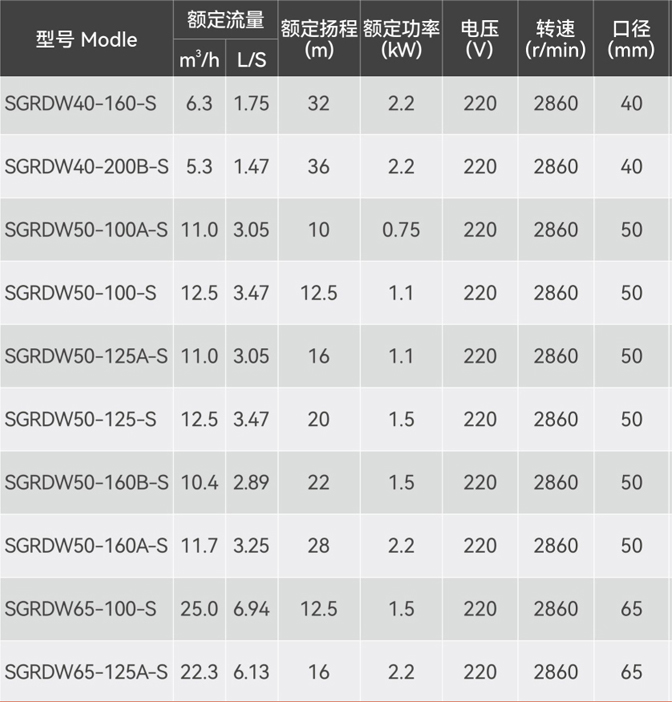 產(chǎn)品介紹 主要用途 SGRDW65-100-S 不銹鋼臥式離心泵可供輸送清水及物理化學(xué)性質(zhì)類似于清水的其他液體之用,適用于工業(yè)和城市給排水、高層建筑增壓送水、園林噴灌、消防增壓、遠(yuǎn)距離輸送、暖通制冷等冷熱水循環(huán)增壓及設(shè)備配套、能源、治金、化工、紡織、造紙以及賓館、飯店等鍋爐熱水增壓輸送及城市采暖系統(tǒng)循環(huán)用泵,使用介質(zhì)溫度T≤103℃。 產(chǎn)品特點 1、泵結(jié)構(gòu)緊湊、體積小、外形美觀。 2、進(jìn)出口徑相同,安裝方便,無需改變管路,可像閥門一樣直接安裝在管路任何部位。 3、機(jī)泵同軸,簡化了中間結(jié)構(gòu),增加了運行的平穩(wěn)性,葉輪具有很好的動靜平衡,運行時震動小、噪音低,延長了軸承的使用壽命,改善了使用環(huán)境。 4、電機(jī)采用高效散熱鑄鋁機(jī)殼、進(jìn)口軸承、不銹鋼316焊接轉(zhuǎn)子軸、氟橡膠“O”形圈、氟橡膠機(jī)械密封,過流部件全部采用不銹鋼精密鑄造。 5、維修方便、無須拆卸管道,只要拆下連接架,取出電機(jī)及傳動組件即可進(jìn)行檢修維護(hù)。 6、其結(jié)構(gòu),精心設(shè)計,不僅縮小了泵房面積,改善了空間,而且大大節(jié)省基建投資。 7、可定制防爆電機(jī),可定制四氟機(jī)封。 使用條件 1、SGRDW65-100-S 不銹鋼臥式離心泵適用介質(zhì):固體不溶物體積含量不超過單位體積的0.1%,粒度不大于0.2mm。(介質(zhì)如帶有細(xì)小顆粒須采用耐磨式機(jī)械密封,請在訂貨時說明。) 2、周圍環(huán)境溫度不超過40℃,相對濕度不超過95%,海拔高度不超過1000m; 3、輸送介質(zhì)的PH值304(4-10)、316(2-13); 4、輸送介質(zhì)的密度≤1.05×103kg/m3; 5、使用電壓220V/380V,頻率50Hz,電壓波動不超過額定值的±10%。 型號說明 ![]() ![]() 因產(chǎn)品生產(chǎn)批次、型號不同,產(chǎn)品圖片及安裝尺寸僅供參考,詳情可聯(lián)系我們的銷售人員了解更多SGRDW65-100-S 不銹鋼臥式離心泵相關(guān)信息!