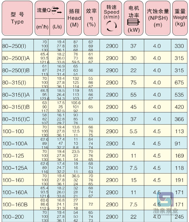產品介紹 ISW80-250(I)B臥式管道離心泵是采用IS型離心泵之性能參數,在一般臥式泵的基礎上進行巧妙組合設計而成,同時根據使用溫度、介質等不同在ISW型管道泵基礎上派生出適用熱水泵、高溫、耐腐蝕化工泵、油泵。該系列產品具有高效節能、噪音低、性能可靠等優點,符合JB/T53058-93的標準要求,產品按ISO2858標準設計制造。具有效率高、流量及揚程范圍大、結構合理、成本低、壽命長、占地面積小、安裝維修方便等特點。是替代IS、DL等常規產品的新離心泵,特別適用于高層建筑的給排水、噴灌、冶金、市政、礦山水處理排污,食品、化工、空調及其他行業輸送水、化學介質及其他液體。 ISW80-250(I)B臥式管道離心泵流量范圍15~1200m3 /h,分基本型、擴流型、A、B、C切割型等250多種規格,并根據流體介質和溫度不同又派生出清水泵、熱水泵、化工泵、防爆油泵、防爆化工泵等系列產品。 主要用途 1、ISW臥式清水泵供輸送清水及物理化學性質類似于清水的其它液體之用,適用于工業和城市給排水、高層建筑增壓送水、園林噴灌、消防增壓、遠距離輸送、暖通制冷循環、浴室等冷暖水循環增壓及設備配套,使用溫度T≤80℃。 2、ISWR臥式熱水泵,廣泛適用于:冶金、化工、紡織、造紙以及賓館飯店等鍋爐熱水增壓循環輸送及城市采暖系統,ISWR型使用溫度T≤120℃。 3、ISWH臥式化工泵,供輸送不含固體顆粒,具有腐蝕性。粘度類似于水的液體,適用于石油、化工、冶金、電力、造紙、食品、制藥和合成纖維等部門,使用溫度為-20℃~+120℃。 4、ISWY臥式管道油泵,供輸送汽油、煤油、柴油等油類產品或易燃、易爆液體,被輸送介質溫度為-20℃~120℃。 5、ISWHY型臥式不銹鋼防爆化工離心泵,適用于輸送易燃性化工液體。 6、ISWD臥式低轉速泵,適應要求環境噪聲很低的場合,使用溫度T≤120℃。 工作條件 1.吸入壓力≤1.0MPa,或泵系統最高工作壓力≤1.6MPa,即吸入口壓力+泵揚程≤1.6MPa、泵靜壓試驗壓力為≤2.5MPa,訂貨時請注明系統工作壓力。泵系統工作壓力大于1.6MPa時應在訂貨時另行提出,以便在制造時泵的過流部分和聯接部分采用鑄鋼材料。 2.環境溫度<40℃,相對濕度<40%。 3.所輸送介質中固體顆粒體積含量不超過單位體積的0.1,粒度<0.2mm。 注:如果用介質為帶有細小顆粒,請在訂貨時說明,以便廠家采用耐磨式機械密封。 產品特點 運行平穩:泵軸的絕對同心度及葉輪優異的動靜平衡,保證平穩運行,絕無振動。 滴水不漏:不同材質的硬質合金密封,保證了不同介質輸送均無泄漏。 噪音低:兩個低噪音軸承支撐下的水泵,運轉平穩,除電機微弱聲響,基本無噪音。 故障率低:結構簡單合理,關鍵部分采用品質配套,整機無故障工作時間大大提高。 維修方便:更換密封、軸承,簡易方便。 占地更省:出口可向左、向右、向上三個方向,便于管道布置安裝,節省空間。 ![]() ![]() ![]() 因產品生產批次、型號不同,產品圖片及安裝尺寸僅供參考,詳情可聯系我們的銷售人員了解更多ISW80-250(I)B臥式管道離心泵相關信息!