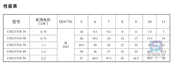 產品介紹 CHLF8-30LSWSC輕型臥式多級離心泵配加長軸電機采用了免修機械密封,緊湊式結構使泵尺寸很小,軸向入口和徑向出口。輕型段式多級離心泵的過流部件均采用不銹鋼材料(304或316)制成,輕型不銹鋼多級離心泵具有低噪音,耐輕腐蝕,外形美觀、體積小、重量輕、使用壽命長等特點,不同材質的硬質合金密封,保證了不同介質輸送均無泄漏;噪音低:兩個低噪音軸承下的水泵,運轉平穩,除電機微弱聲響,基本無噪聲;故障率低:結構簡單合理,整機無故障工作時間大大提高。采用國內優秀水力模型優化設計而成,是理想的新一代高效節能輕型臥式多級離心泵。采用了免修機械密封。輕型段式多級離心泵的過流部件均采用不銹鋼材料(304或316)制成,具有低噪音,耐輕腐蝕,外形美觀、體積小、重量輕、使用壽命長等特點。 二、應用范圍: 主要用于家庭型中央空調循環及工業上液體的傳輸。如脫礦物質水、軟水、凈化系統、輕油等的循環和增壓。 1)小型中央空調循環 2)冷卻系統 3)工業清洗 4)水處理(水的凈化) 5)水產養殖 6)施肥/計量系統 7)環境應用 三、工作條件: 稀薄、干凈、不凝、不爆炸、不含固體顆粒或纖維的液體。 液體溫度: 常溫型-15℃至+70℃ 熱水型+70℃至+110℃ 最大環境溫度:+40℃ 最大運作壓力:10巴 最大進口壓力受最大運作壓力限制 介質酸堿性:PH4~9 四、輸送液體: 1、稀薄、清潔、不含固體顆粒或纖維的非易燃易爆液體。 2、泵可以輸送諸如礦泉水、軟化水、純水、清油和其它輕化工介質。 3、當輸送液體的密度或粘度大于水,如需要,必須配用大功率電機。 4、泵是否適用于某一特定液體由多種因素決定,其中最重要的是氯含量、PH值、溫度和溶濟、油的含量等。 五、曲線條件: 下述條件適用于后面所示性能曲線。 1、所有曲線都基于電機在恒速2900rpm的測量值。 2、曲線容差符合ISO9906,附錄A。 3、測試采用20℃不含空氣的水,運動粘度為1mm2/s。 4、泵的使用參照加粗曲線的性能范圍,以防流量過小產生過熱和流量過大使電機過載等。 六、電機: CHLF8-40LSWSC輕油增壓泵電機為全封閉,風冷式二極電機 防護等級:IP55 絕緣等級:F 標準電壓, 50Hz: 1×220-240V 3×220-240V 380-415V ![]() 因產品生產批次、型號不同,產品圖片及安裝尺寸僅供參考,詳情可聯系我們的銷售人員了解更多CHLF8-30LSWSC輕型臥式多級離心泵相關信息!