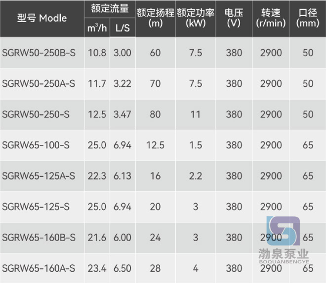 產品介紹 主要用途 SGRW50-250-S不銹鋼臥式管道離心泵可供輸送清水及物理化學性質類似于清水的其他液體之用,適用于工業和城市給排水、高層建筑增壓送水、園林噴灌、消防增壓、遠距離輸送、暖通制冷等冷熱水循環增壓及設備配套、能源、治金、化工、紡織、造紙以及賓館、飯店等鍋爐熱水增壓輸送及城市采暖系統循環用泵,使用介質溫度T≤103℃。 產品特點 1、泵結構緊湊、體積小、外形美觀。 2、進出口徑相同,安裝方便,無需改變管路,可像閥門一樣直接安裝在管路任何部位。 3、機泵同軸,簡化了中間結構,增加了運行的平穩性,葉輪具有很好的動靜平衡,運行時震動小、噪音低,延長了軸承的使用壽命,改善了使用環境。 4、電機采用高效散熱鑄鋁機殼、進口軸承、不銹鋼316焊接轉子軸、氟橡膠“O”形圈、氟橡膠機械密封,過流部件全部采用不銹鋼精密鑄造。 5、維修方便、無須拆卸管道,只要拆下連接架,取出電機及傳動組件即可進行檢修維護。 6、其結構,精心設計,不僅縮小了泵房面積,改善了空間,而且大大節省基建投資。 7、可定制防爆電機,可定制四氟機封。 使用條件 1、適用介質:固體不溶物體積含量不超過單位體積的0.1%,粒度不大于0.2mm。(介質如帶有細小顆粒須采用耐磨式機械密封,請在訂貨時說明。) 2、周圍環境溫度不超過40℃,相對濕度不超過95%,海拔高度不超過1000m; 3、輸送介質的PH值304(4-10)、316(2-13); 4、輸送介質的密度≤1.05×103kg/m3; 5、使用電壓220V/380V,頻率50Hz,電壓波動不超過額定值的±10%。 型號說明 ![]() ![]() 因產品生產批次、型號不同,產品圖片及安裝尺寸僅供參考,詳情可聯系我們的銷售人員了解更多SGRW50-250-S不銹鋼臥式管道離心泵相關信息!