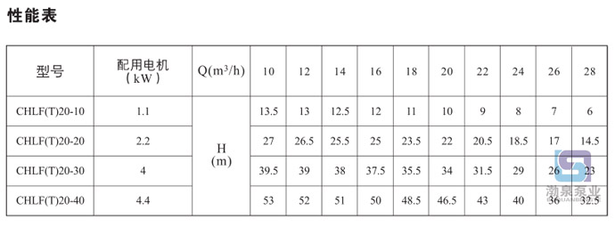 產品介紹 CHLF20-40LSWSC輕型臥式多級離心泵配加長軸電機采用了免修機械密封,緊湊式結構使泵尺寸很小,軸向入口和徑向出口。輕型段式多級離心泵的過流部件均采用不銹鋼材料(304或316)制成,輕型不銹鋼多級離心泵具有低噪音,耐輕腐蝕,外形美觀、體積小、重量輕、使用壽命長等特點,不同材質的硬質合金密封,保證了不同介質輸送均無泄漏;噪音低:兩個低噪音軸承下的水泵,運轉平穩,除電機微弱聲響,基本無噪聲;故障率低:結構簡單合理,整機無故障工作時間大大提高。采用國內優秀水力模型優化設計而成,是理想的新一代高效節能輕型臥式多級離心泵。采用了免修機械密封。輕型段式多級離心泵的過流部件均采用不銹鋼材料(304或316)制成,具有低噪音,耐輕腐蝕,外形美觀、體積小、重量輕、使用壽命長等特點。 二、應用范圍: 主要用于家庭型中央空調循環及工業上液體的傳輸。如脫礦物質水、軟水、凈化系統、輕油等的循環和增壓。 1)小型中央空調循環 2)冷卻系統 3)工業清洗 4)水處理(水的凈化) 5)水產養殖 6)施肥/計量系統 7)環境應用 三、工作條件: 稀薄、干凈、不凝、不爆炸、不含固體顆粒或纖維的液體。 液體溫度: 常溫型-15℃至+70℃ 熱水型+70℃至+110℃ 最大環境溫度:+40℃ 最大運作壓力:10巴 最大進口壓力受最大運作壓力限制 介質酸堿性:PH4~9 四、輸送液體: 1、稀薄、清潔、不含固體顆粒或纖維的非易燃易爆液體。 2、泵可以輸送諸如礦泉水、軟化水、純水、清油和其它輕化工介質。 3、當輸送液體的密度或粘度大于水,如需要,必須配用大功率電機。 4、泵是否適用于某一特定液體由多種因素決定,其中最重要的是氯含量、PH值、溫度和溶濟、油的含量等。 五、曲線條件: 下述條件適用于后面所示性能曲線。 1、所有曲線都基于電機在恒速2900rpm的測量值。 2、曲線容差符合ISO9906,附錄A。 3、測試采用20℃不含空氣的水,運動粘度為1mm2/s。 4、泵的使用參照加粗曲線的性能范圍,以防流量過小產生過熱和流量過大使電機過載等。 六、電機: 電機為全封閉,風冷式二極電機 防護等級:IP55 絕緣等級:F 標準電壓, 50Hz: 1×220-240V 3×220-240V 380-415V ![]() 因產品生產批次、型號不同,產品圖片及安裝尺寸僅供參考,詳情可聯系我們的銷售人員了解更多CHLF20-40LSWSC輕型臥式多級離心泵相關信息!