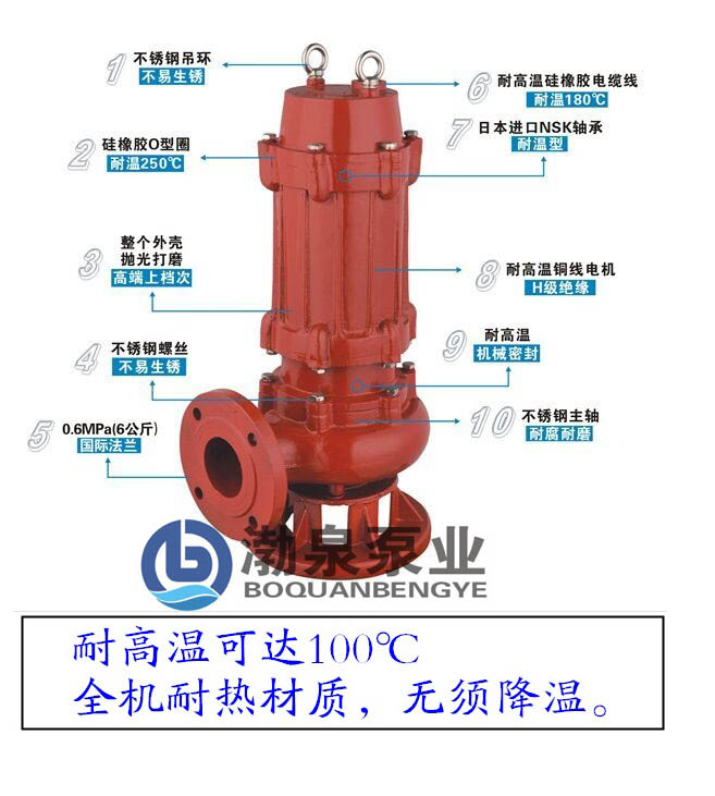 | 耐高溫排污泵采用高溫銅線、H級絕緣材料制作電機,耐高溫絕緣漆浸泡線圈。保證能在100度以內(nèi)的介質(zhì)中長時間運行。 | 1、日本進口耐高溫NSK軸承 2、可耐溫250度的O型圈 3、可耐溫250度的電纜線 4、耐高溫的雙端面合金機械密封 |